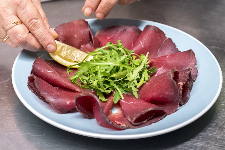 Tagliata di controfiletto con pancetta di cinta senese, rucola e pecorino